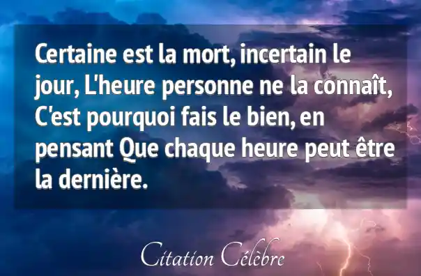 Certaine est la mort, incertain le jour, L'heure personne ne la connaît, C'est pourquoi fais le bien, en pensant Que chaque heure peut être la dernière.