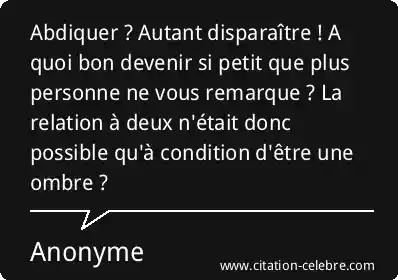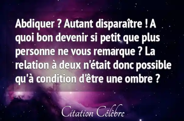 Abdiquer ? Autant disparaître ! A quoi bon devenir si petit que plus personne ne vous remarque ? La relation à deux n'était donc possible qu'à condition d'être une ombre ?
