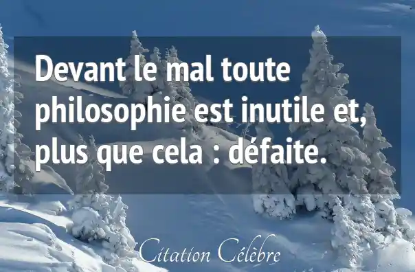 Cette citation, forte et sans concession, affirme que face à l’expérience brute et concrète du Mal (souffrance, injustice, horreur), la philosophie, en tant que tentative d'explication, de justification ou de consolation par la raison et le discours, devient non seulement inutile mais se retrouve même en état de défaite. Le Mal est une réalité qui excède et anéantit la capacité de la pensée abstraite à le circonscrire ou à le rendre tolérable.