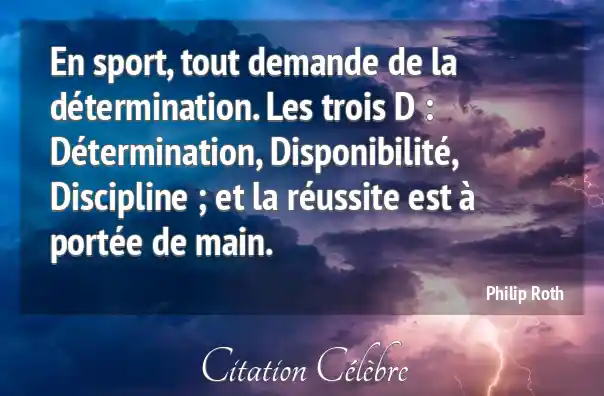 Malgré l'attribution souvent trouvée en ligne, cette citation n'est pas une œuvre reconnue de l'écrivain américain Philip Roth, lauréat du prix Pulitzer. L'association de cette formule de développement personnel et sportif avec un auteur de fiction littéraire sérieux est très probablement une erreur d'attribution ou une confusion courante sur Internet. L'origine exacte de la formule des « trois D » dans le contexte sportif est difficile à tracer, mais elle est typique des maximes de motivation.