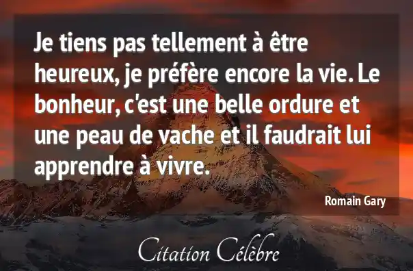 Je tiens pas tellement à être heureux, je préfère encore la vie. Le bonheur, c'est une belle ordure et une peau de vache et il faudrait lui apprendre à vivre.