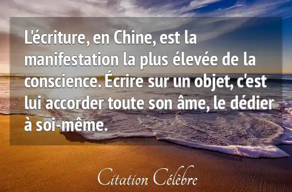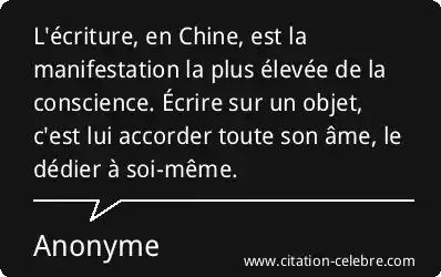 L'écriture, en Chine, est la manifestation la plus élevée de la conscience. Écrire sur un objet, c'est lui accorder toute son âme, le dédier à soi-même.