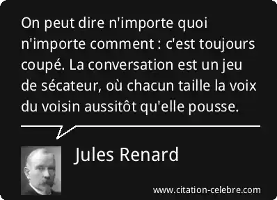 On peut dire n'importe quoi n'importe comment : c'est toujours coupé. La conversation est un jeu de sécateur, où chacun taille la voix du voisin aussitôt qu'elle pousse.