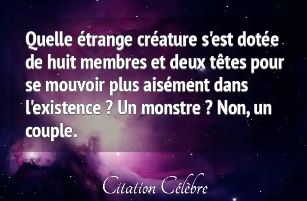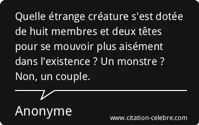 Quelle étrange créature s'est dotée de huit membres et deux têtes pour se mouvoir plus aisément dans l'existence ? Un monstre ? Non, un couple.