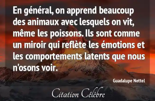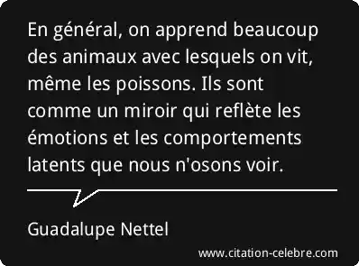 En général, on apprend beaucoup des animaux avec lesquels on vit, même les poissons. Ils sont comme un miroir qui reflète les émotions et les comportements latents que nous n'osons voir.