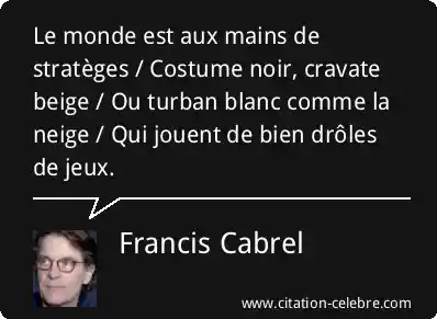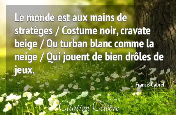 Le monde est aux mains de stratèges / Costume noir, cravate beige / Ou turban blanc comme la neige / Qui jouent de bien drôles de jeux.