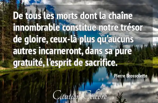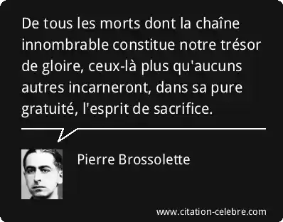 De tous les morts dont la chaîne innombrable constitue notre trésor de gloire, ceux-là plus qu'aucuns autres incarneront, dans sa pure gratuité, l'esprit de sacrifice.