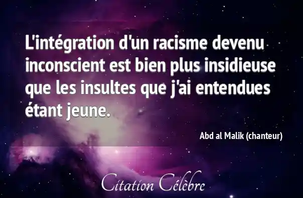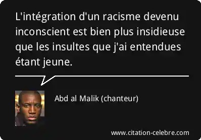 Citation Abd al Malik (chanteur) bien : L'intégration d'un racisme devenu inconscient est bien plus insidieuse que...