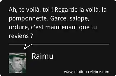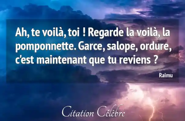 Ah, te voilà, toi ! Regarde la voilà, la pomponnette. Garce, salope, ordure, c'est maintenant que tu reviens ?
