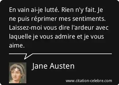 En vain ai-je lutté. Rien n'y fait. Je ne puis réprimer mes sentiments. Laissez-moi vous dire l'ardeur avec laquelle je vous admire et je vous aime.