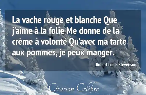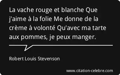 La vache rouge et blanche Que j'aime à la folie Me donne de la crème à volonté Qu'avec ma tarte aux pommes, je peux manger.