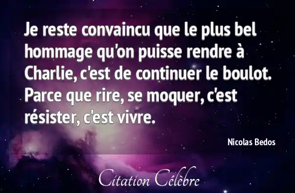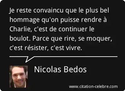 Je reste convaincu que le plus bel hommage qu'on puisse rendre à Charlie, c'est de continuer le boulot. Parce que rire, se moquer, c'est résister, c'est vivre.