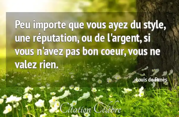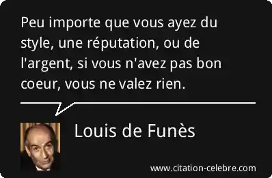 Cette puissante déclaration de Louis de Funès affirme que les qualités internes et la bonté du cœur sont la véritable mesure de la valeur d'une personne, éclipsant complètement les attributs externes comme le style, la réputation, ou la richesse matérielle (l'argent). En substance, elle établit que sans une bonne moralité et de la compassion, les succès extérieurs sont insignifiants.