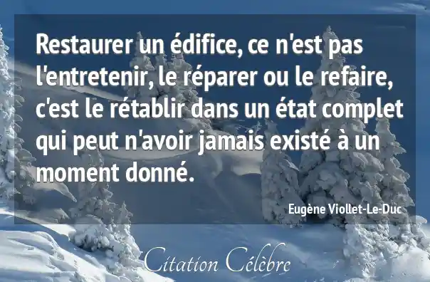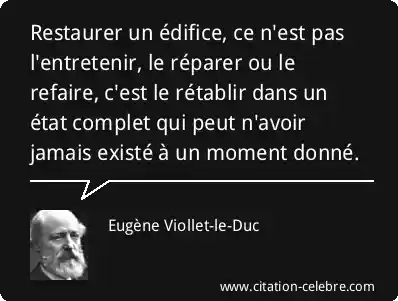 Restaurer un édifice, ce n'est pas l'entretenir, le réparer ou le refaire, c'est le rétablir dans un état complet qui peut n'avoir jamais existé à un moment donné.