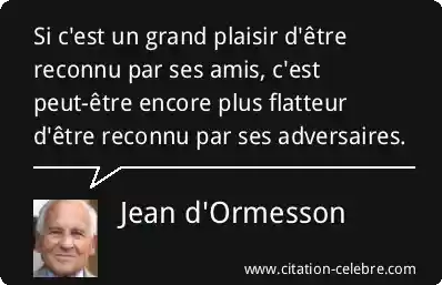 Cette citation de Jean d'Ormesson exprime une idée subtile sur la nature de la reconnaissance et de la flatterie. Elle pose que si l'approbation et l'admiration de ceux qui nous sont proches et qui partagent nos valeurs (nos amis) est agréable, la reconnaissance qui vient de ceux qui s'opposent à nous ou sont en compétition avec nous (nos adversaires) est encore plus valorisante et "flatteuse".