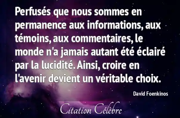 Perfusés que nous sommes en permanence aux informations, aux témoins, aux commentaires, le monde n'a jamais autant été éclairé par la lucidité. Ainsi, croire en l'avenir devient un véritable choix.