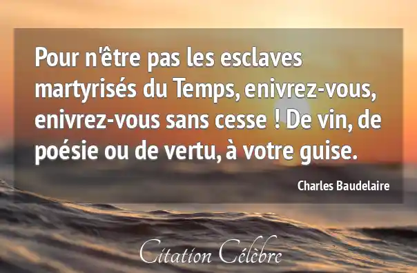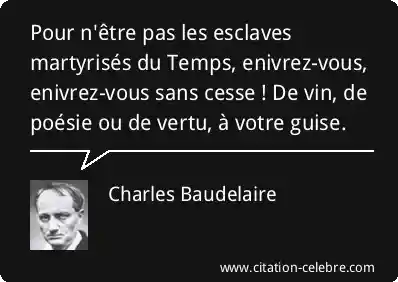 Pour n'être pas les esclaves martyrisés du Temps, enivrez-vous, enivrez-vous sans cesse ! De vin, de poésie ou de vertu, à votre guise.