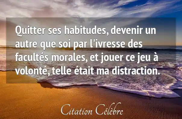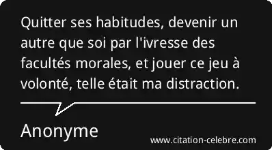 Quitter ses habitudes, devenir un autre que soi par l'ivresse des facultés morales, et jouer ce jeu à volonté, telle était ma distraction.