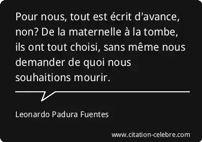 Pour nous, tout est écrit d'avance, non? De la maternelle à la tombe, ils ont tout choisi, sans même nous demander de quoi nous souhaitions mourir.