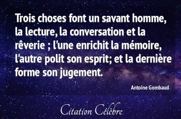 Trois choses font un savant homme, la lecture, la conversation et la rêverie ; l'une enrichit la mémoire, l'autre polit son esprit; et la dernière forme son jugement.