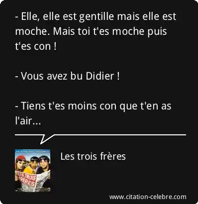 - Elle, elle est gentille mais elle est moche. Mais toi t'es moche puis t'es con ! - Vous avez bu Didier ! - Tiens t'es moins con que t'en as l'air...