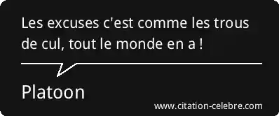 Bien que rendue célèbre par le film, l'expression "Les excuses c'est comme les trous de cul, tout le monde en a" (ou sa variante anglaise "Excuses are like assholes, everybody's got one") est considérée comme une citation populaire et anonyme qui circulait déjà. Elle est souvent attribuée à tort à des figures publiques ou à des films divers. Dans le contexte de Platoon, le réalisateur Oliver Stone l'a probablement reprise pour son caractère brutal et terre-à-terre, parfaitement adapté à l'environnement militaire.