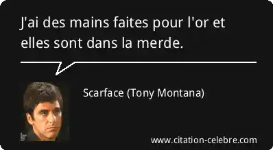 L'internaute découvre une image frappante de contraste. Tony Montana affirme que ses mains ont la capacité, le talent ou la destinée de manipuler quelque chose de précieux, d'extrêmement rentable et symboliquement pur (l'or). Or, ces mêmes mains sont actuellement dans la « merde », c'est-à -dire dans un travail sale, dégradant, pénible ou méprisable, qui est littéralement et figurativement associé à l'immondice et à la basse condition.