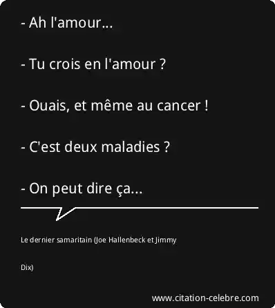 - Ah l'amour... - Tu crois en l'amour ? - Ouais, et même au cancer ! - C'est deux maladies ? - On peut dire ça...