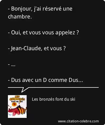 - Bonjour, j'ai réservé une chambre. - Oui, et vous vous appelez ? - Jean-Claude, et vous ? - ... - Dus avec un D comme Dus...