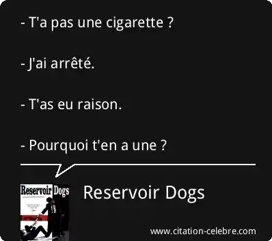 - T'a pas une cigarette ? - J'ai arrêté. - T'as eu raison. - Pourquoi t'en a une ?