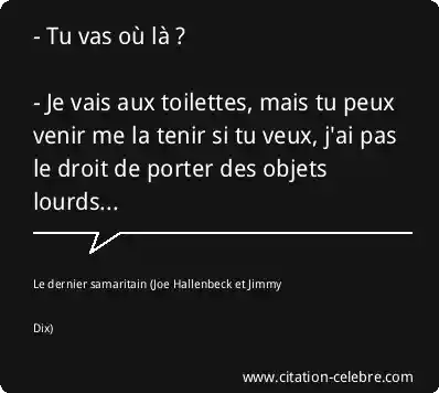 - Tu vas où là ? - Je vais aux toilettes, mais tu peux venir me la tenir si tu veux, j'ai pas le droit de porter des objets lourds...