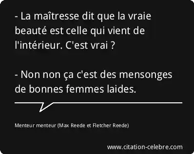 - La maîtresse dit que la vraie beauté est celle qui vient de l'intérieur. C'est vrai ? - Non non ça c'est des mensonges de bonnes femmes laides.