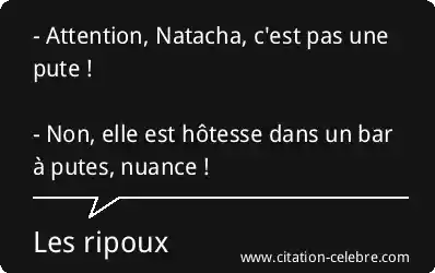 - Attention, Natacha, c'est pas une pute ! - Non, elle est hôtesse dans un bar à putes, nuance !