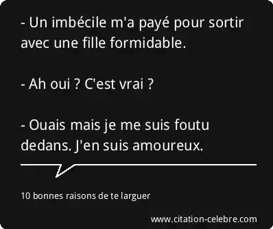 - Un imbécile m'a payé pour sortir avec une fille formidable. - Ah oui ? C'est vrai ? - Ouais mais je me suis foutu dedans. J'en suis amoureux.