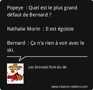 Popeye : Quel est le plus grand défaut de Bernard ? Nathalie Morin : Il est égoïste Bernard : Ça n'a rien à voir avec le ski.