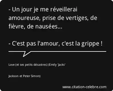 - Un jour je me réveillerai amoureuse, prise de vertiges, de fièvre, de nausées... - C'est pas l'amour, c'est la grippe !