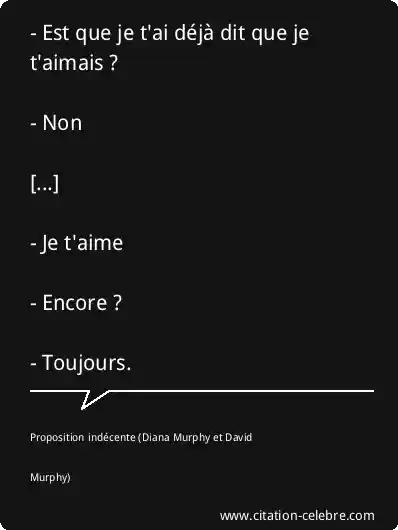 Cette réplique est tirée du film "Proposition Indécente" (titre original : "Indecent Proposal"), sorti en 1993. Elle est prononcée entre les personnages principaux, Diana Murphy (jouée par Demi Moore) et David Murphy (joué par Woody Harrelson).