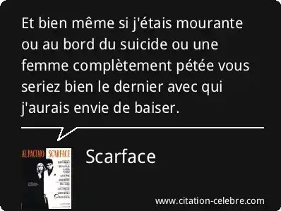Et bien même si j'étais mourante ou au bord du suicide ou une femme complètement pétée vous seriez bien le dernier avec qui j'aurais envie de baiser.