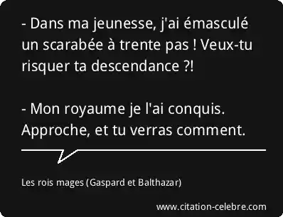 - Dans ma jeunesse, j'ai émasculé un scarabée à trente pas ! Veux-tu risquer ta descendance ?! - Mon royaume je l'ai conquis. Approche, et tu verras comment.
