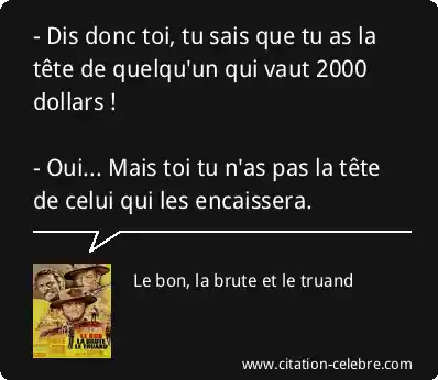 - Dis donc toi, tu sais que tu as la tête de quelqu'un qui vaut 2000 dollars ! - Oui... Mais toi tu n'as pas la tête de celui qui les encaissera.