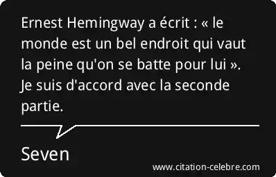 Ernest Hemingway a écrit : « le monde est un bel endroit qui vaut la peine qu'on se batte pour lui ». Je suis d'accord avec la seconde partie.