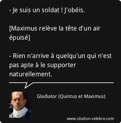 - Je suis un soldat ! J'obéis. [Maximus relève la tête d'un air épuisé] - Rien n'arrive à quelqu'un qui n'est pas apte à le supporter naturellement.