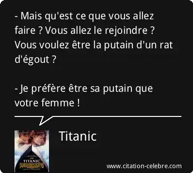 - Mais qu'est ce que vous allez faire ? Vous allez le rejoindre ? Vous voulez être la putain d'un rat d'égout ? - Je préfère être sa putain que votre femme !