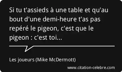 Si tu t'assieds à une table et qu'au bout d'une demi-heure t'as pas repéré le pigeon, c'est que le pigeon : c'est toi...