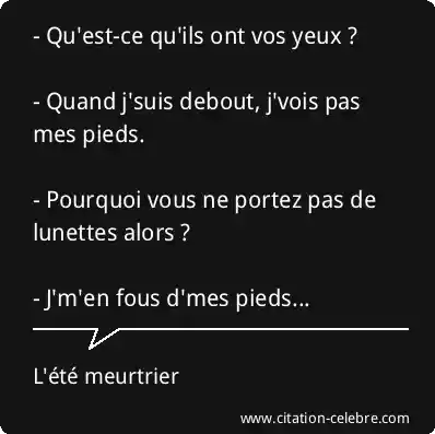 - Qu'est-ce qu'ils ont vos yeux ? - Quand j'suis debout, j'vois pas mes pieds. - Pourquoi vous ne portez pas de lunettes alors ? - J'm'en fous d'mes pieds...