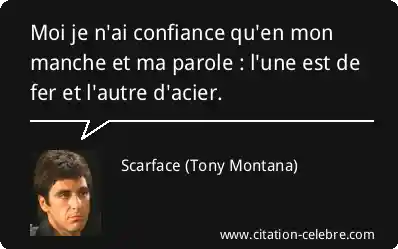 Tony Montana est l'incarnation de l'homme qui part de rien et s'élève par la force de sa volonté et sa violence. La réplique "Moi je n'ai confiance qu'en mon manche et ma parole" résume parfaitement sa personnalité narcissique, son paranoïsme croissant et son besoin d'autonomie totale. Il se définit par sa capacité à agir (le manche) et à maintenir son code d'honneur personnel (la parole), rejetant les liens sociaux qu'il perçoit comme des faiblesses.