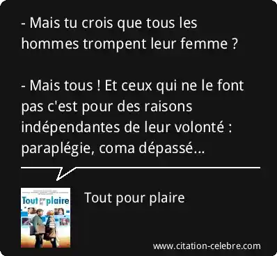 - Mais tu crois que tous les hommes trompent leur femme ? - Mais tous ! Et ceux qui ne le font pas c'est pour des raisons indépendantes de leur volonté : paraplégie, coma dépassé...