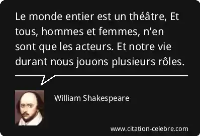 Cette célèbre formule de William Shakespeare exprime l'idée que la vie humaine, dans son intégralité, peut être perçue comme une vaste représentation théâtrale. Le « monde entier » est la scène, et les « hommes et femmes » sont les comédiens. Nous ne faisons qu'entrer et sortir de cette scène, et le cours de notre existence est une succession de « rôles » que nous jouons, souvent malgré nous, selon notre âge, notre position sociale et les circonstances.