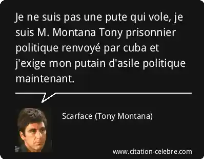 Je ne suis pas une pute qui vole, je suis M. Montana Tony prisonnier politique renvoyé par cuba et j'exige mon putain d'asile politique maintenant.