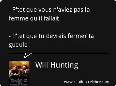 - P'tet que vous n'aviez pas la femme qu'il fallait. - P'tet que tu devrais fermer ta gueule !
